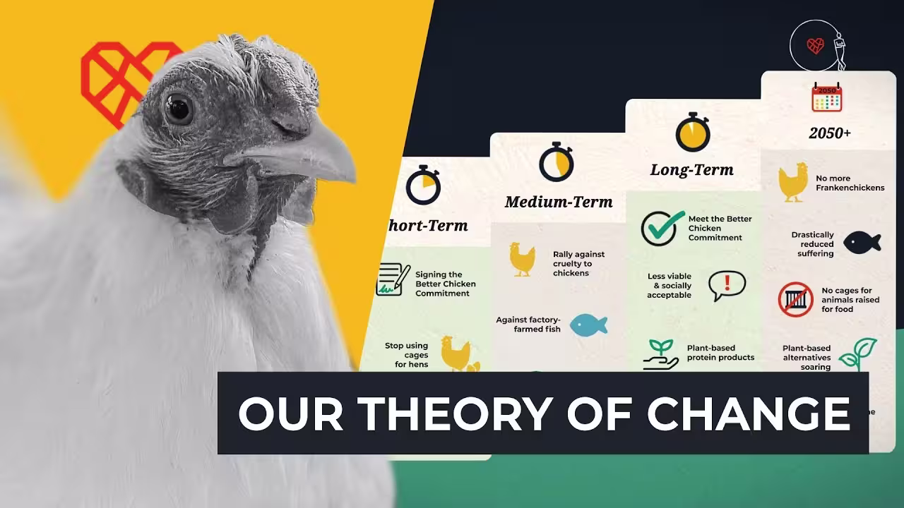 Our Theory of Change is a map that outlines the steps we take to achieve our mission. Short-term, medium-term, and long-term outcomes lead us to a world where we've stopped the worst and most widespread abuse of animals raised for food, and they're treated with far greater compassion.